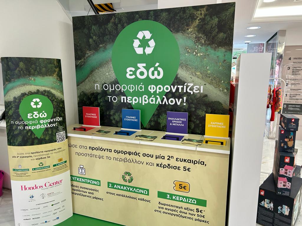 Σύστημα κάδων για τη διαλογή στην πηγή των συσκευασιών των συνεργαζόμενων 18 μαρκών καλλυντικών, το οποίο βρίσκεται στο Hondos Γλυφάδα