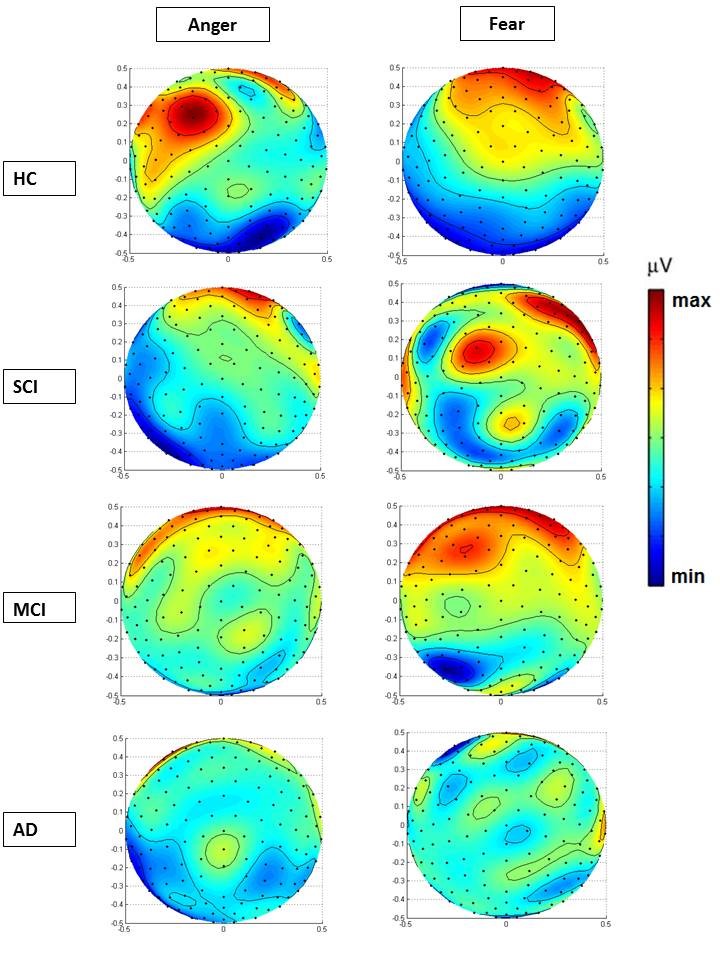 Summarizing the main findings, SCI group compared to HC, had statistical significant larger amplitude to negative faces, while brain activation in frontocentral areas, during N170 elicitation was less than expected compared with HC. Similarly, MCI and AD group exhibited also larger N170 amplitudes while less brain activation, in the respective areas, was observed compared to HC. Supposing that facial processing acts as cue to trigger activation of stored configural representations and memory, the difference in SCI compared to HC may at least partly explain the impaired processing after presentation of negative faces. In contrast to HC, the SCI group exhibited enhanced N170 amplitude for “Fear” compared to the negative emotion of “Anger”. N170 topographic maps differ between the two negative stimuli among the four groups, while less frontal brain activation was noticed in elders with cognitive deterioration compared to HC group (Figure 1). This outcome leads us to believe that cognitive impairment affects fronto-temporal and occipito-parietal areas, which take part in facial emotional processing. These findings pave the way to investigate the changes taking place in neural activation at cognitively impaired conditions associated with neuro-degenerative diseases such as SCI, as prodromal stage of cognitive impairment related to AD and demonstrate an interesting shifting of the location of maximum neural activation for the two negative emotions. More specifically, in the case of “Fear” the maximum intensity level appeared in frontal lobe in the most cognitively intact groups, whereas in groups with cognitive impairment less activity in frontal areas was found, showing that N170 component is generated by “top-down influences”, arising from higher order regions of the cortex. Thus, identifying SCI by N170 modulation may facilitate the planning of future prevention and treatment of cognitive decline associated to pathological cognitive aging, and particular to the processes related to AD.