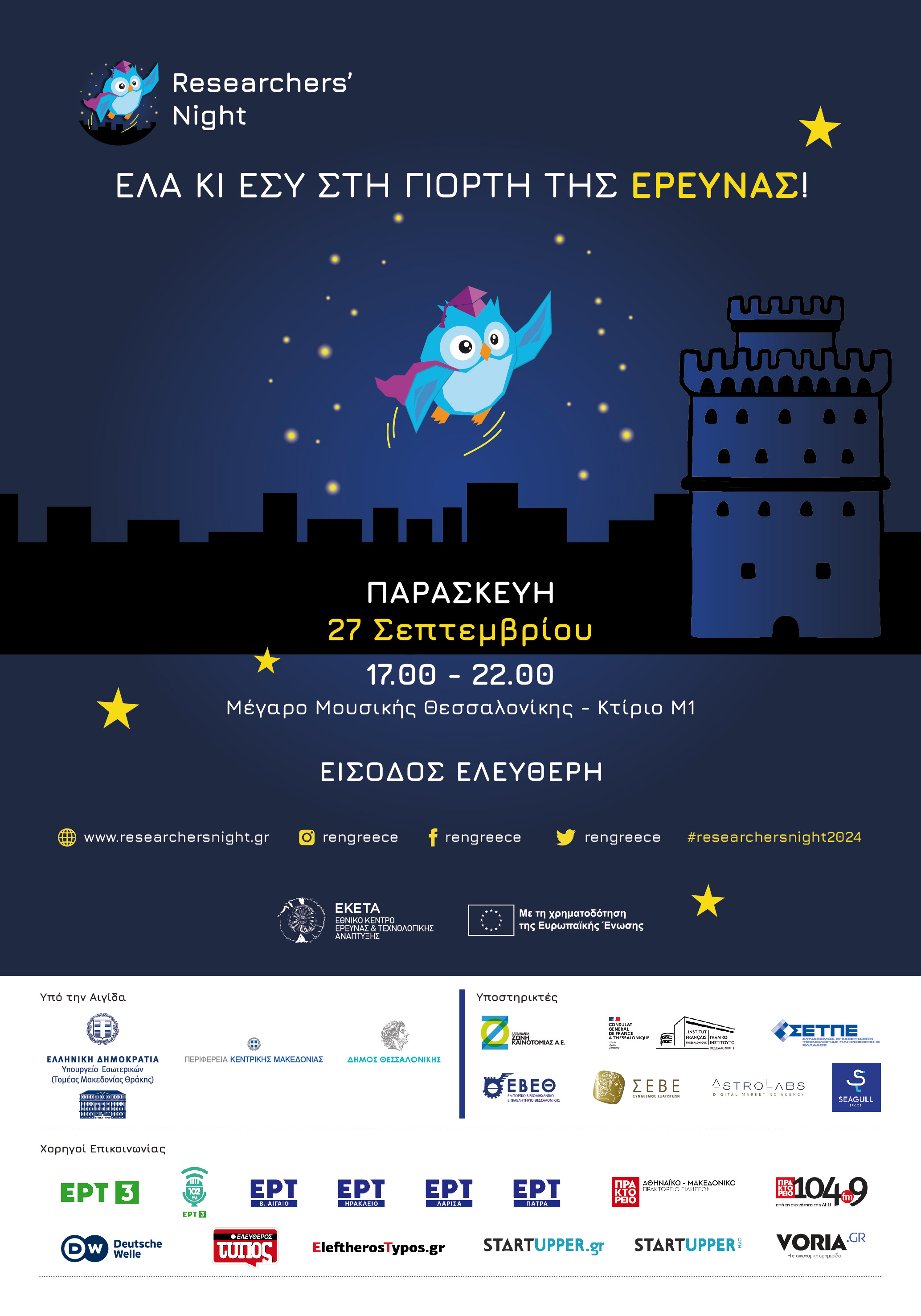Ακολουθώντας την παράδοση των τελευταίων 16 ετών, το Εθνικό Κέντρο Έρευνας και Τεχνολογικής Ανάπτυξης διοργανώνει και συντονίζει τη Βραδιά του Ερευνητή στη Θεσσαλονίκη, την Παρασκευή, 27 Σεπτεμβρίου 2024 στο Μέγαρο Μουσικής (κτίριο Μ1).